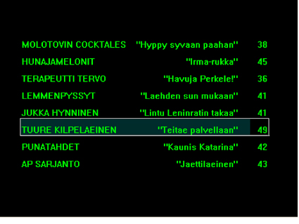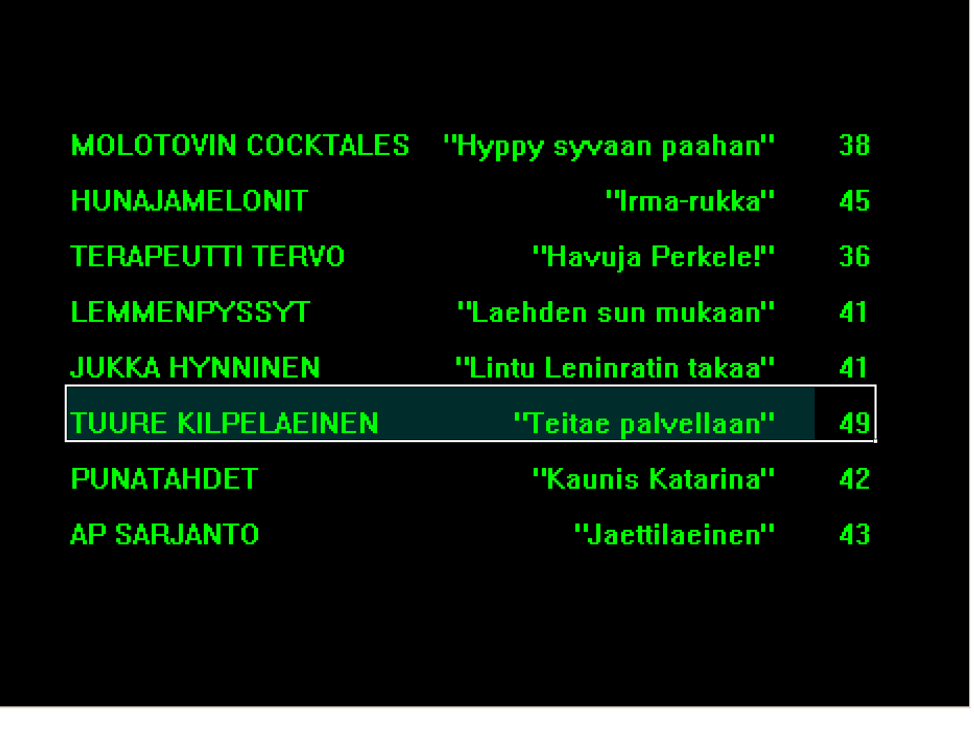 Juryn kommentit: TERAPEUTTI TERVON SULJETTU OSASTO Terapeutti Tervon Suljettu Osasto on bändi, jota johtaa ja luotsaa laulaja-lauluntekijä Miika Tervo. Terapeutti Tervo on maailmaa syvästi ymmärtävä viisas ja valaistunut ihminen. Hänen kaitsemansa Suljettu Osasto taas koostuu maailman myrskyissä sukeltaneista paljon elämää kokeneista monissa liemissä keitetyistä ihmisistä. Interviisut ovat TTSO:n ensimmäinen esiintyminen ja tavoitteena on tietenkin voitto ja ensipalkinto. Sanoma on myös tärkeä ja siksi TTSO esittää laulun, joka kertoo nykysuomen poliittisen elämän keskiössä tapahtuneista ilmiöistä, jotka ovat tulleet kansalle tutummaksi kuin itse politiikka. Havuja Perkele!(säv.san. miika tervo) voisi olla vaikka oodi päämisterille tai ulkoministerillemme. Se kertoo perheellisen miehen työpaikkaromanssista menestyvän perheenisän näkökulmasta. Kun suksi alkaa luistamaan ja pito loppuu, niin lipsumista ei voi estää ja skandaali on valmis. Havuja Perkele! kertoo maukkaan tarinan koko kansan tunteman perheenisän syrjähypystä ja sen aiheuttamista sisäisistä tunnoista vähän ennen kuin skandaalista tuli julkinen. Terapeutti Tervo ei kuitenkaan moralisoi, vaan on kaikkien puolella eikä ketään vastaan. Hän yrittää nähdä ristiriitaisen elämän vaikeissakin tilanteissa kauneutta, elämisen meininkiä! Havuja Perkele! on itse asiassa rakkauslaulu.